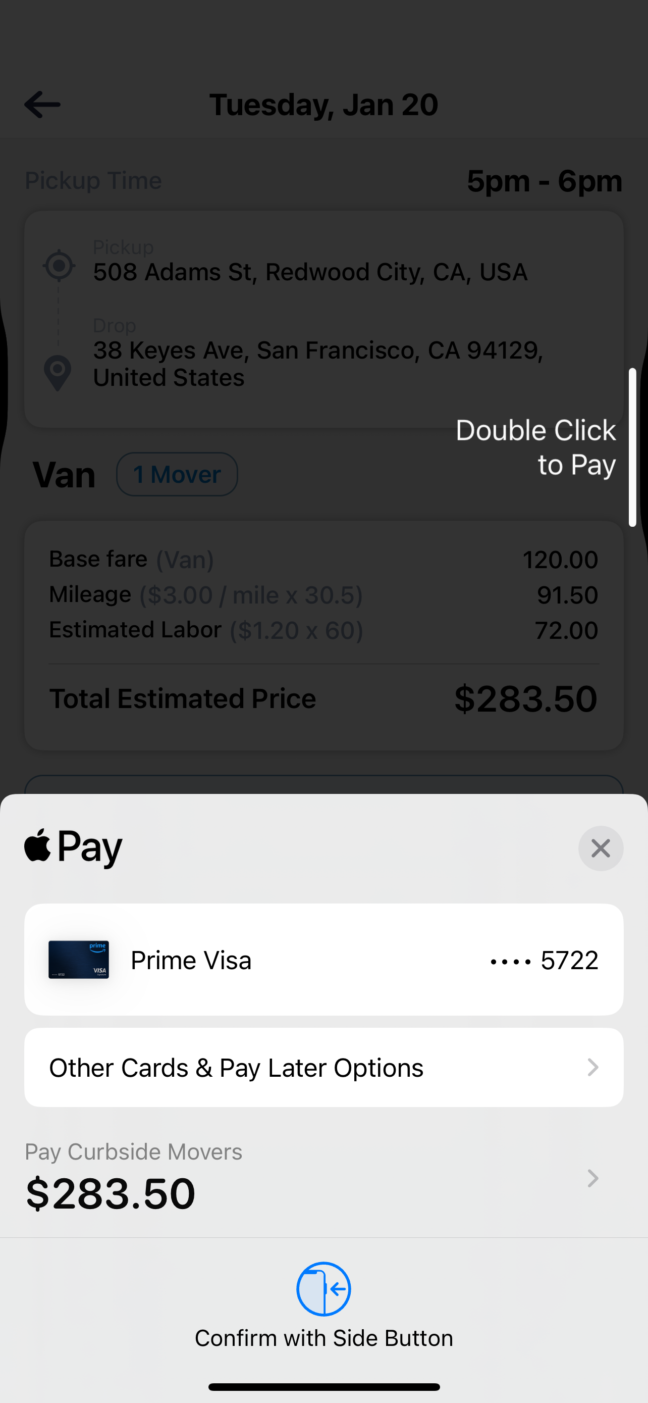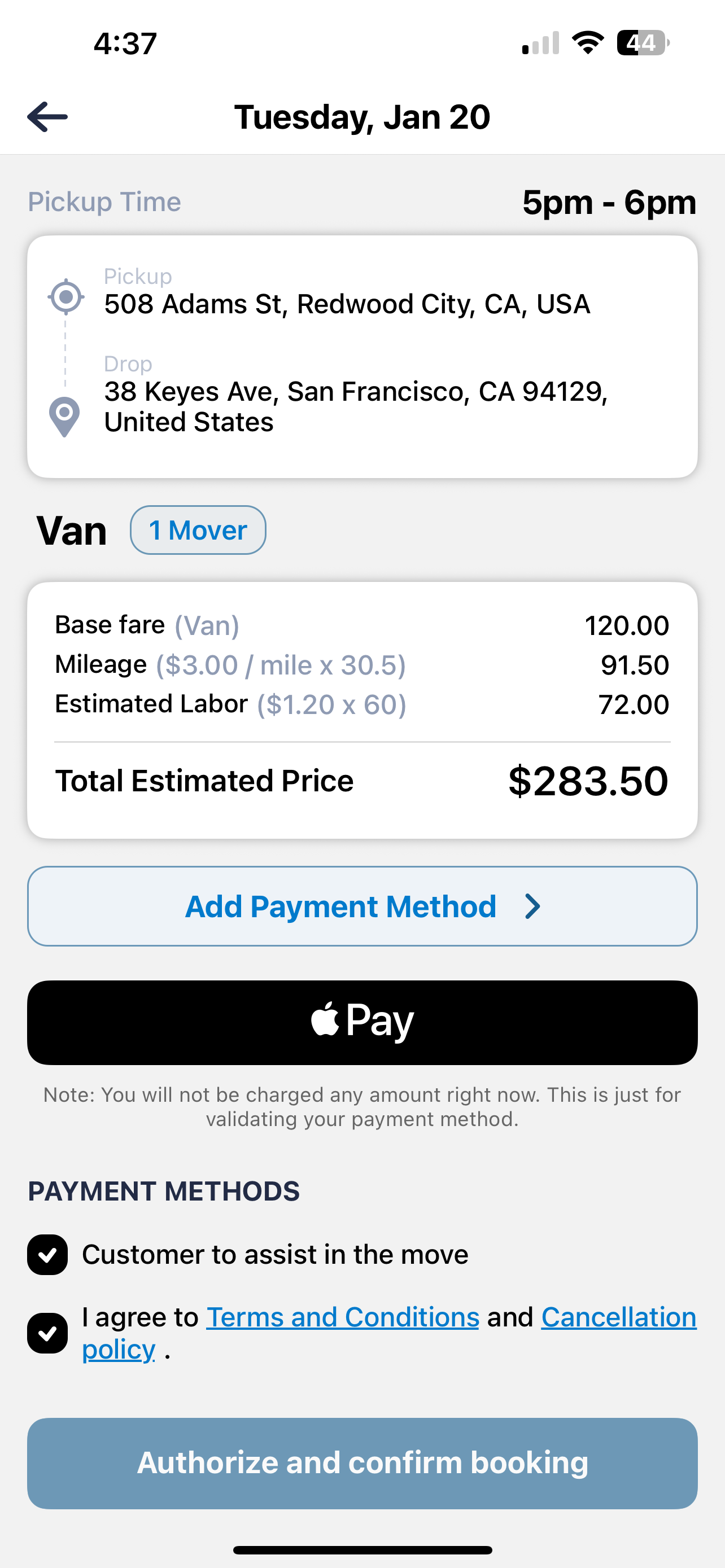 Confirm your time, upload photos of your items, and pay securely via Apple Pay.